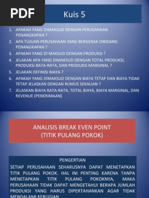 Secara prinsip, definisi break even point (bep) adalah sebuah titik impas dimana biaya pengeluaran (modal) dan pendapatan seimbang/sama sehingga tidak terdapat kerugian ataupun keuntungan didalam perusahaan maupun usaha dagang yang akan dan sedang dijalani. Titik pulang pokok (tpp)/ break even point (bep) adalah titik keseimbangan antara jumlah hasil penjualan dengna. Titik pulang modal (bep) adalah istilah dalam perakaunan yang merujuk kepada keadaan di mana pendapatan dan perbelanjaan syarikat adalah sama dalam tempoh perakaunan tertentu tahun fiskal (fy) tahun fiskal (fy) adalah tempoh 12 bulan atau 52 minggu masa yang digunakan oleh kerajaan dan perniagaan untuk tujuan perakaunan untuk menyusun laporan kewangan tahunan. Formula bagi titik pulang modal adalah kos tetap/perbelanjaan tetap terhadap sumbangan per unit. Purata harga jualan setiap unit (pendapatan per unit): Penjabatanan mengikut division (produk, pasaran, dan geografi) Tp1 menyenaraikan komponen kos pengeluaran. Analisis tentang perhubungan antara kos, volum (kuantiti jualan) dan untung bagi sesuatu aktiviti atau operasi pengeluaran sesebuah syarikat. 16.3 analisis titik pulang modal. Mengira titik pulang modal hanyalah menjalankan perniagaan yang berkembang maju. Jika dianalisis, semua kos perlu ditambah, hanya pulangan belian, inventori akhir bahan langsung dan kerja dalam proses akhir sahaja perlu ditolak 7.3 analisis titik pulang modal Sama besar pendapatan dengan modal, tanpa laba; Maklumat mengenai titik pulang modal penting bagi pihak pengurusan kerana ia menunjukkan tahap minimum jualan yang perlu diperoleh oleh perniagaan supaya ia tidak mengalami kerugian.